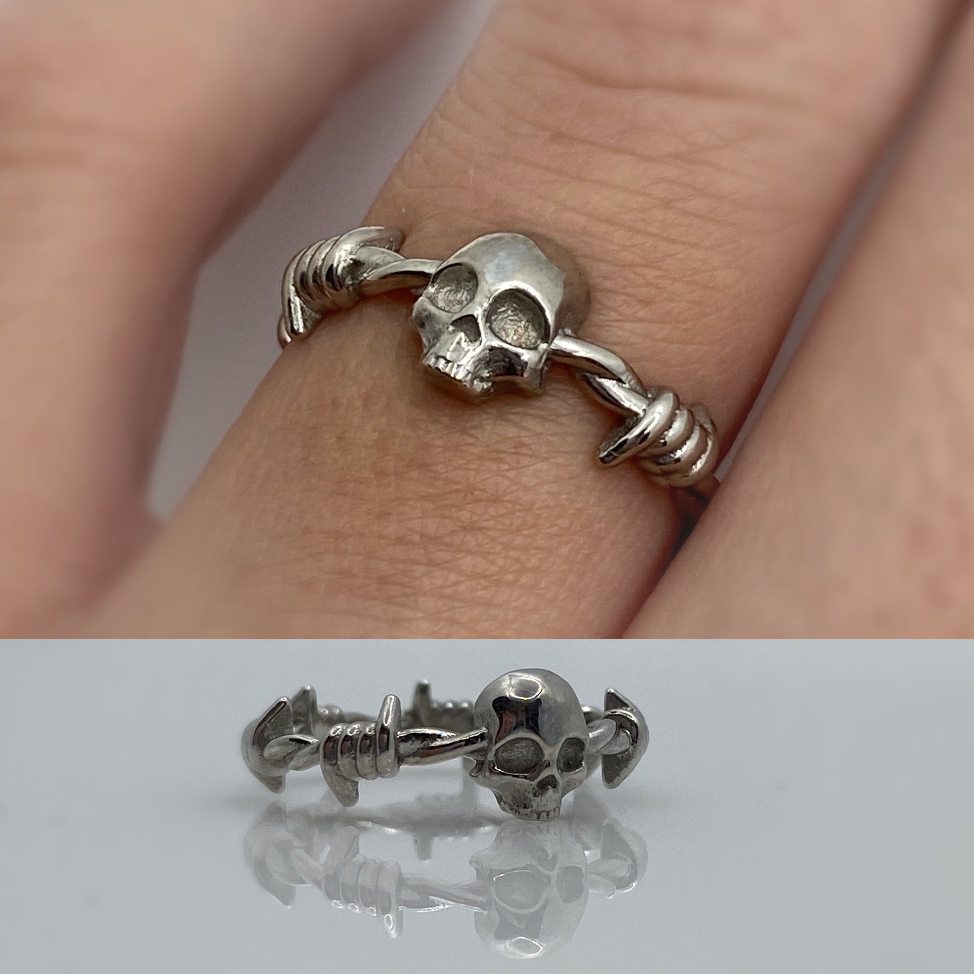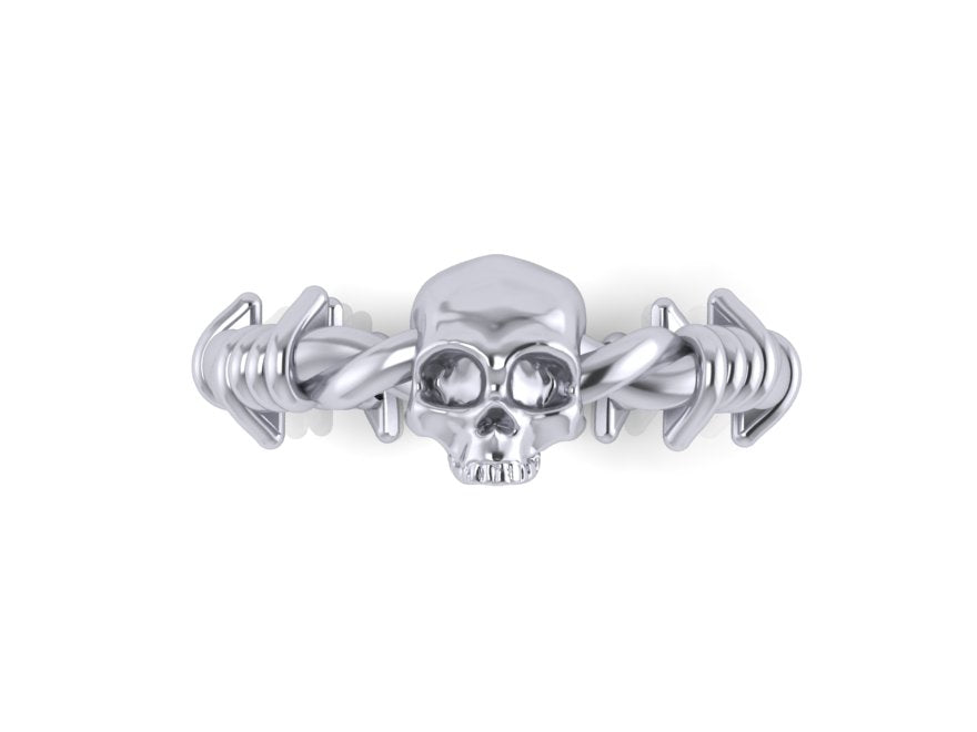 This fashion ring features a barbed wire designed band with a skull head in the center.