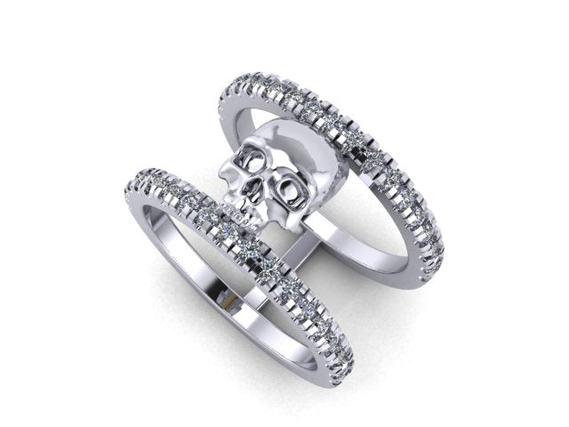 This ring features two bands with a large skull head in the middle. This ring measures about 12.3mm long.