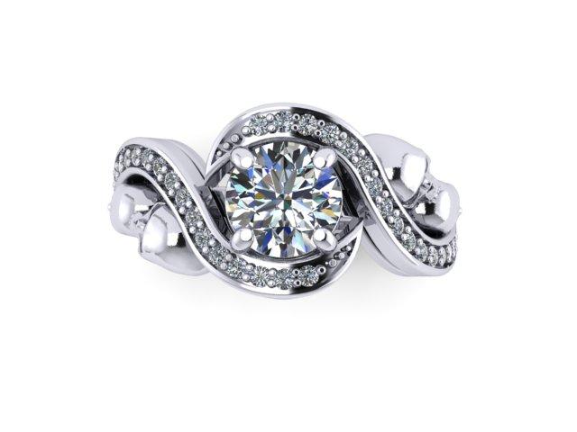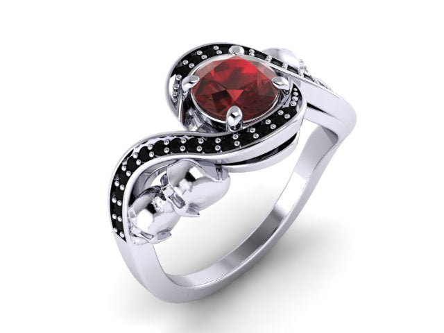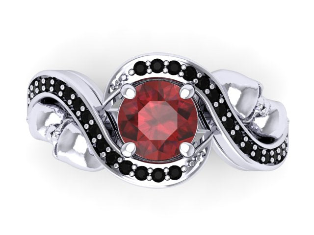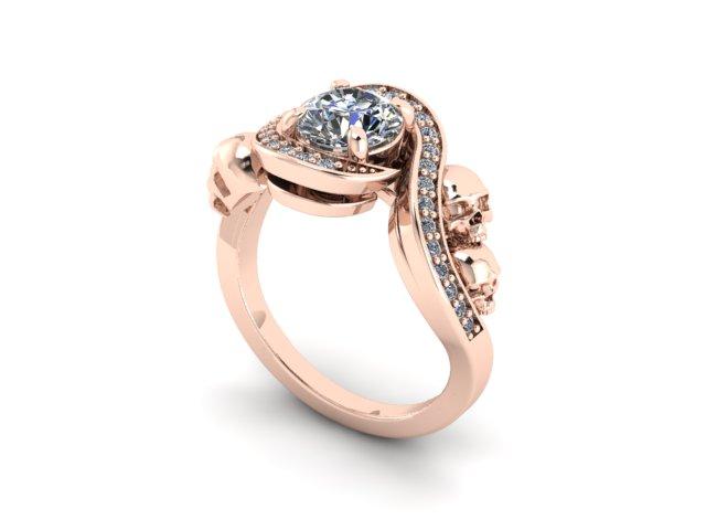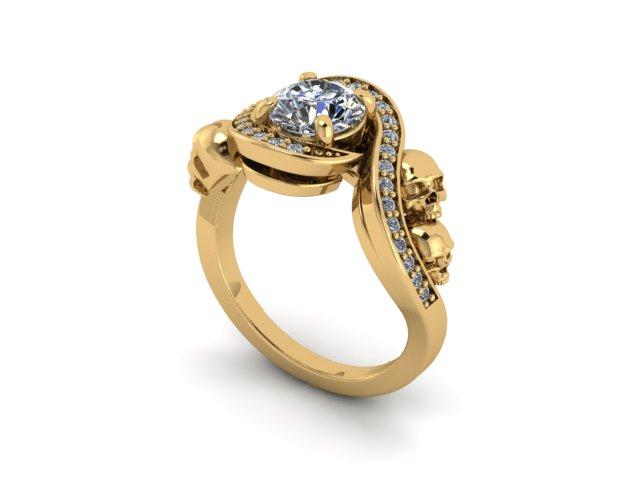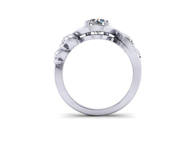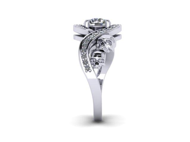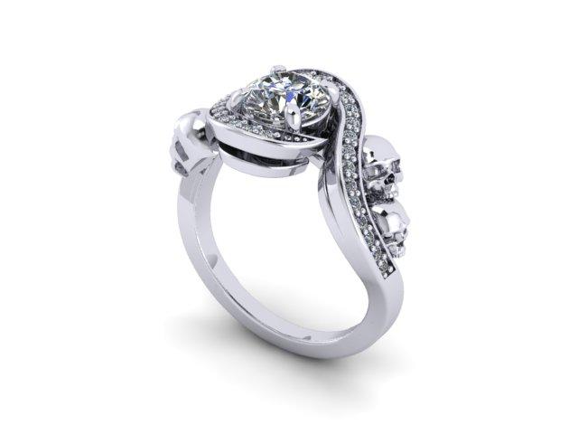 The setting has a 6.5mm round shaped center stone with 30 1.2mm side stones. A total of four skull heads accent this ring perfectly: