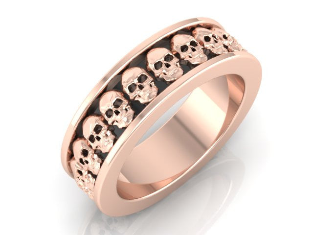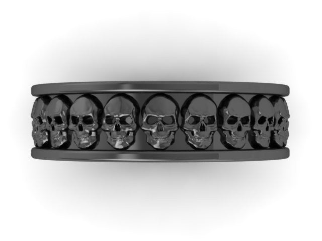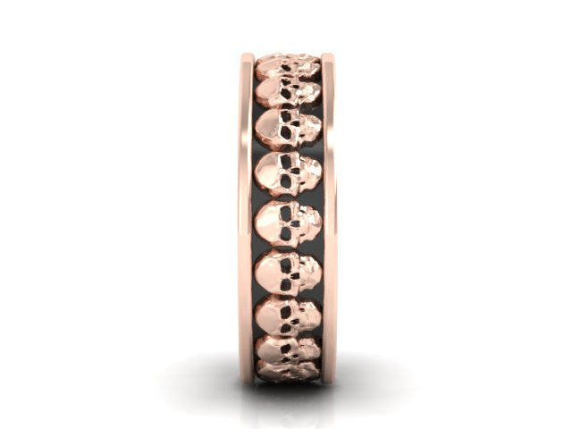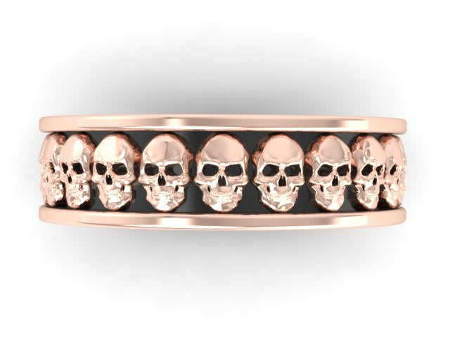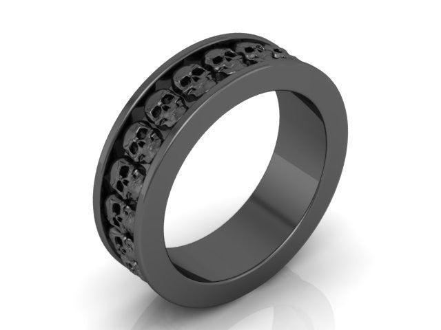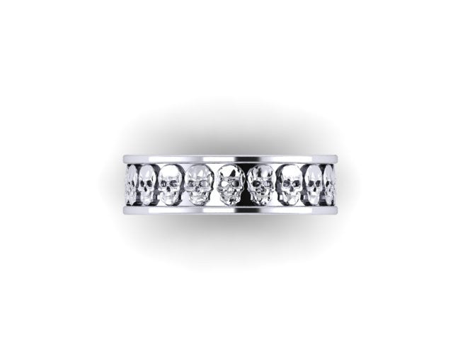This Men's Wedding Band is eternity style band with small skulls all the way around. This band is 8mm wide.