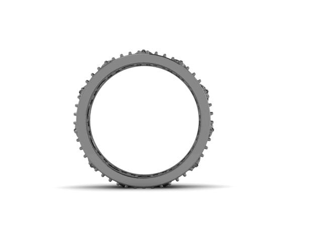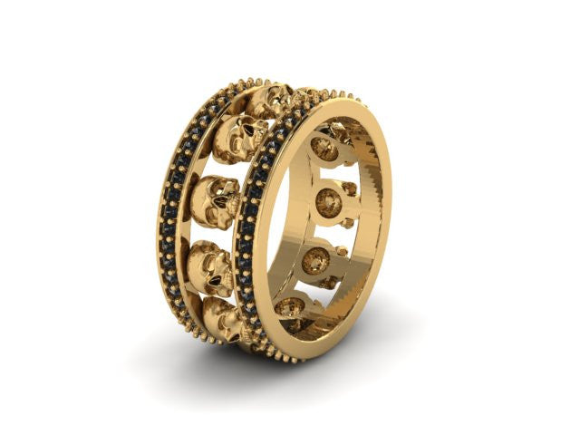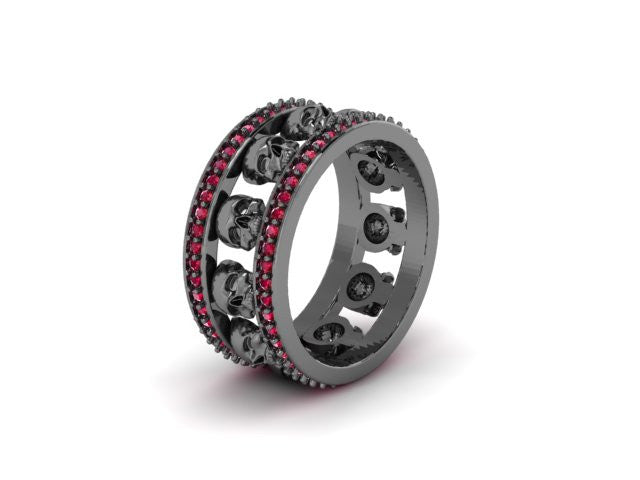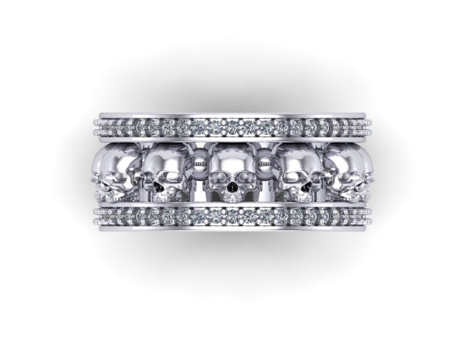 This Men's Wedding Band is eternity style band with small skulls all the way around and two rows of 1.0mm diamonds.