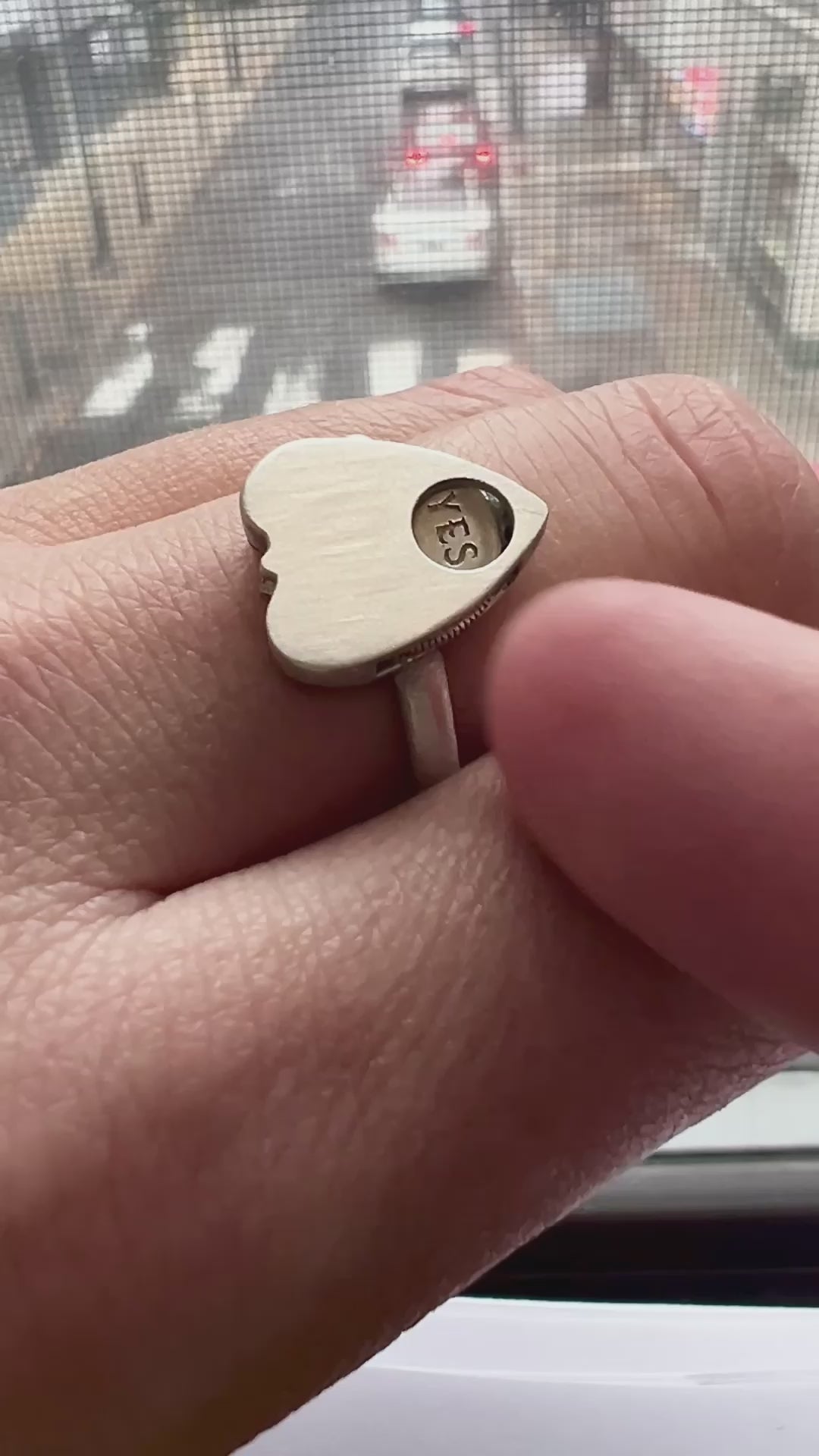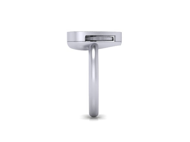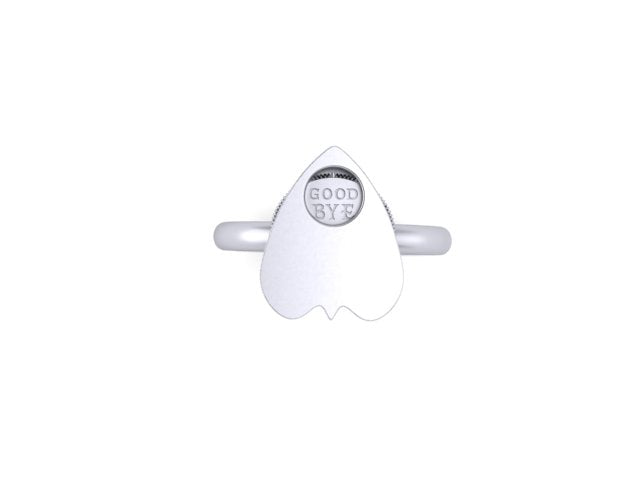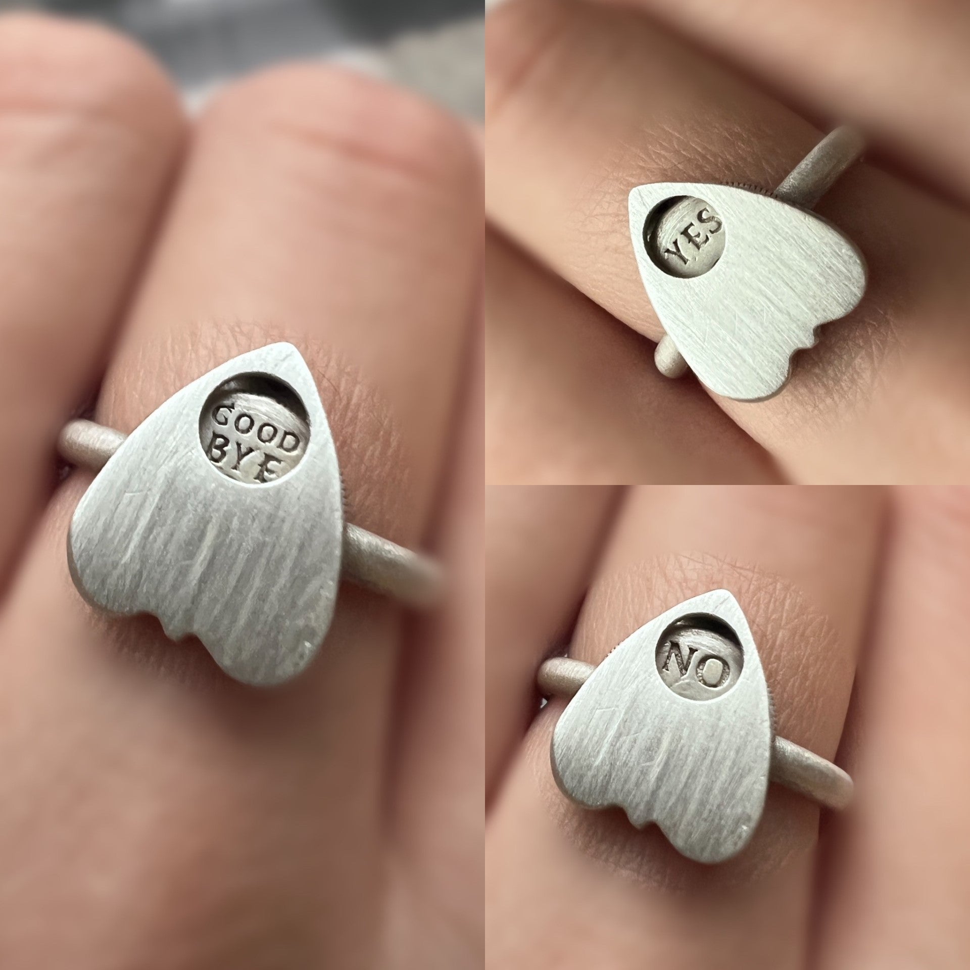 .925 Silver ring with spinning answer dial. Choose between a high polish or satin finish. Dial features three answers: "Yes," "No," & "Goodbye".