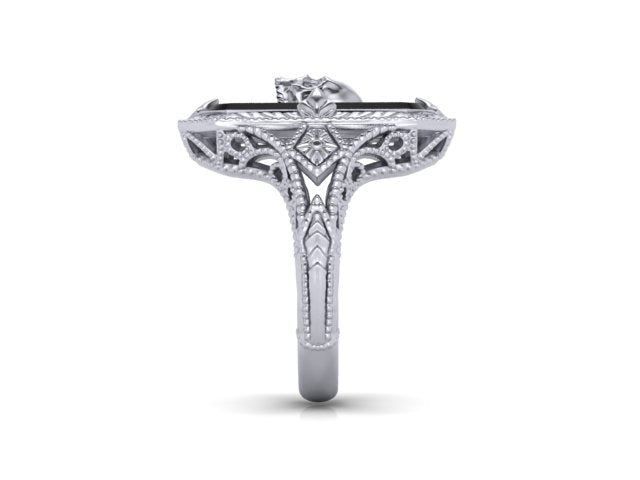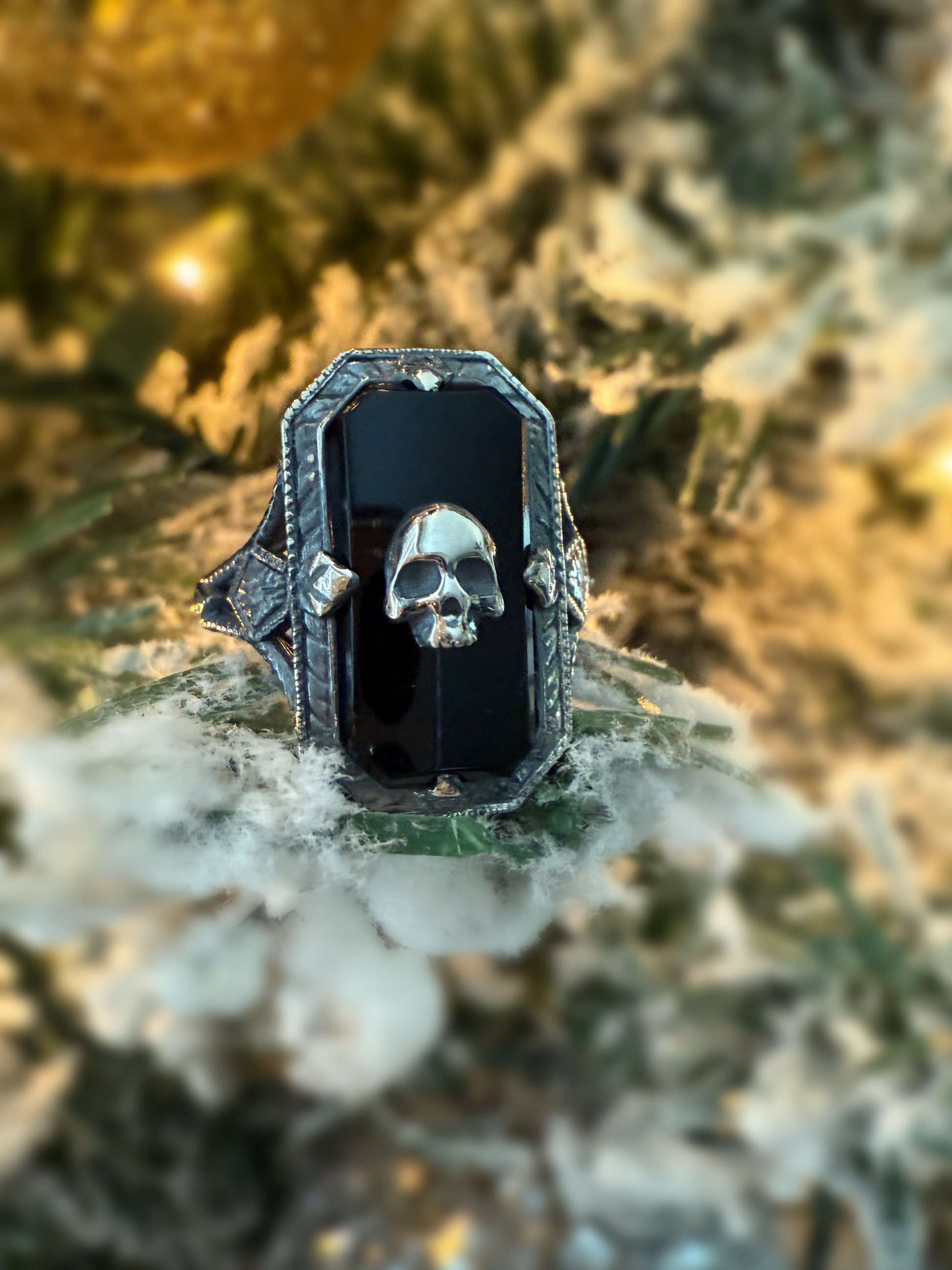 Specifications: This silver ring features a black onyx stone with a skull head centered, delicate engravings decorate the ring. Finishing color can be antiqued (like real time photos,) or shiny silver (like computer renderings.)