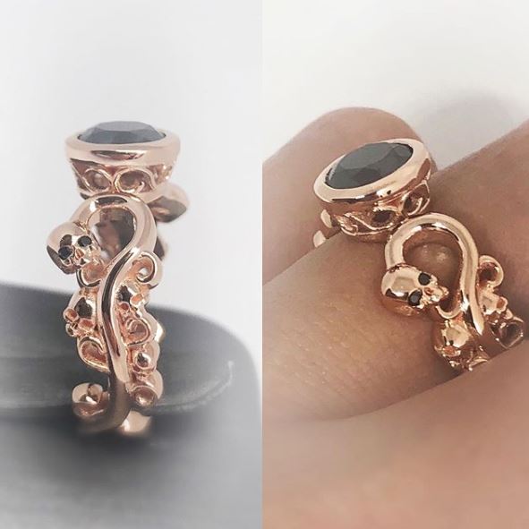 This engagement ring has a 6.5mm center stone of your choice which is bezel set. Down the shank are several swirls and tiny skulls.