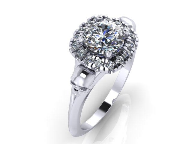 6.5mm round center stone approx. 1carat -This engagement ring features a cushion shaped halo, two skulls and a split shank.