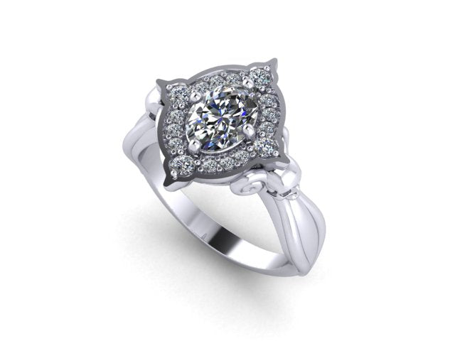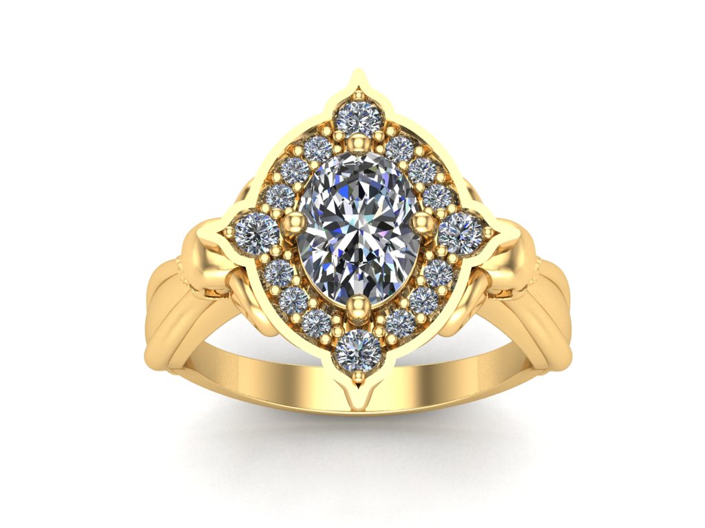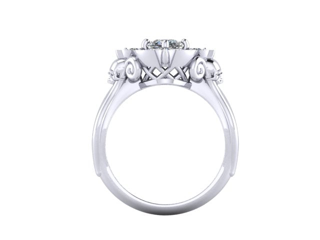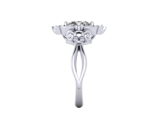 This halo-style engagement ring holds an oval center stone, two skulls, and an intricate under-gallery.
