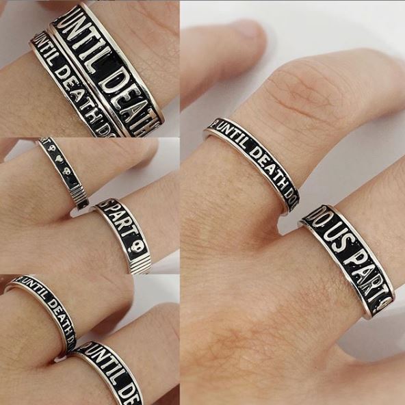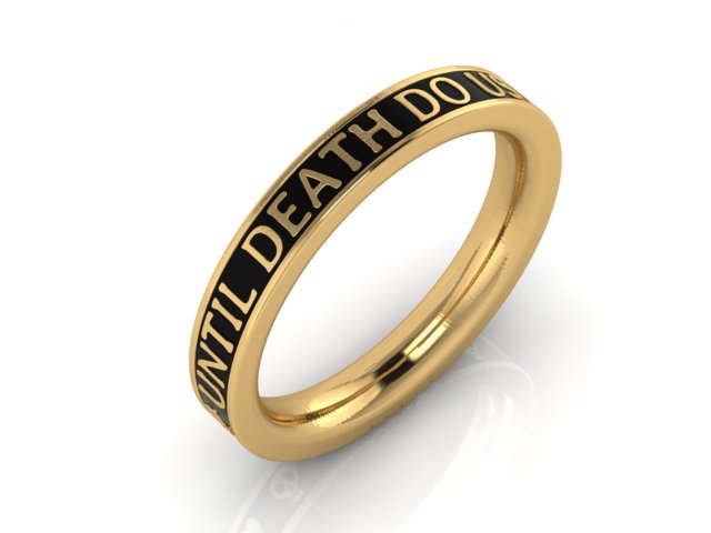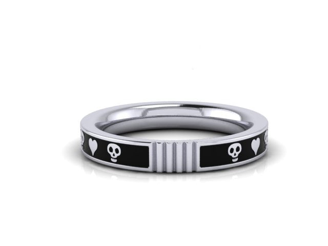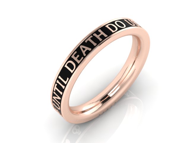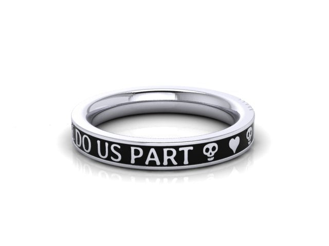 This simple band holds the words, "Until Death Do Us Part," once around the band with tiny skulls and tiny hearts. The background of this ring will be black enameled with high polished words. It is approximately 3mm wide. A matching wider band is available, UDINC0674B.
